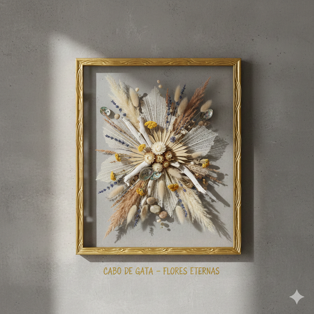 Para este cuadro hemos elegido pequeños toques de lavanda morada seca y flores amarillas (siemprevivas) que añaden sutiles pinceladas de color que recuerdan al matorral mediterráneo. Junto a ellas unas plumas de pampas largas y suaves en tonos beige y marrón claro. Y para el toque final se han incorporado pequeños guijarros de playa pulidos por el mar y fragmentos de madera a la deriva (palo seco), integrando la geología única del parque natural.