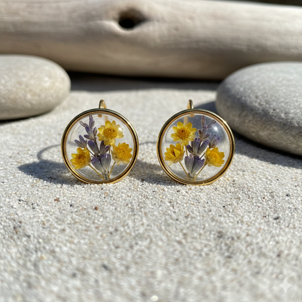 Cada pendiente presenta una meticulosa composición de Siempreviva Dorada y Lavanda de Mar, recogidas con respeto y encapsuladas de forma artesanal en una resina cristalina de alta transparencia. El marco circular y los herrajes dorados añaden un brillo cálido y distinguido, complementando los tonos naturales de las flores y aportando un toque de glamour sutil.