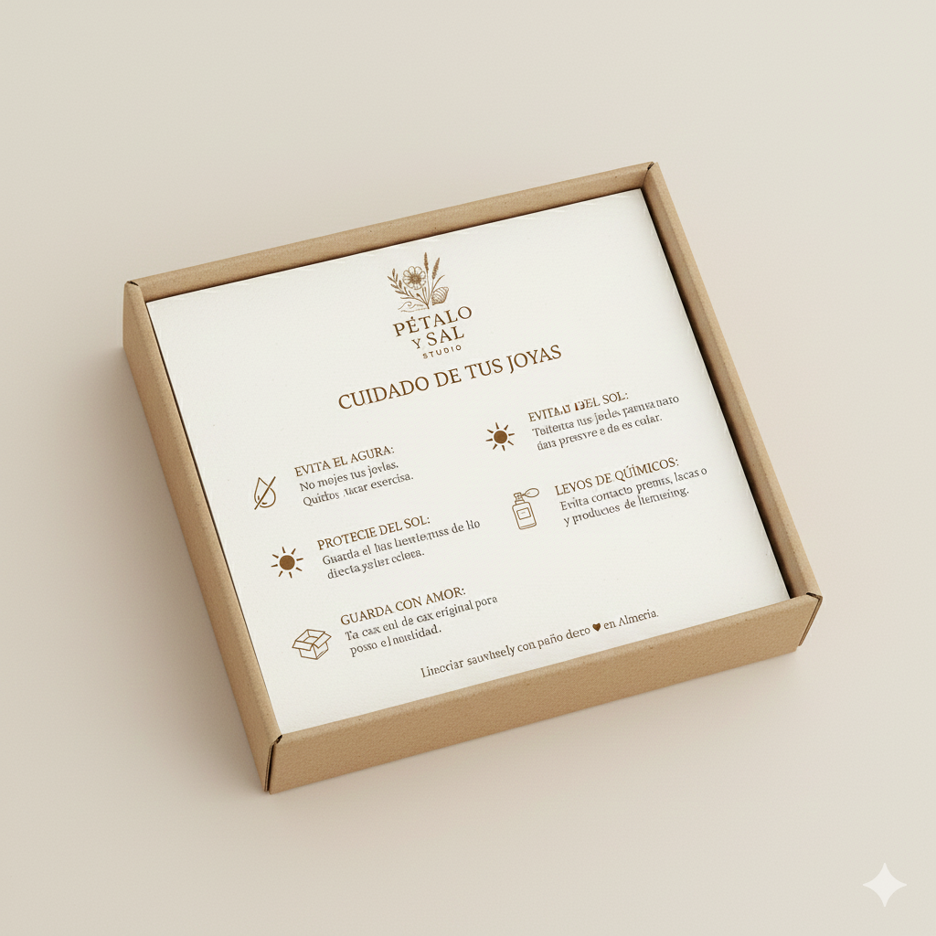 Tus Pendientes «Cabo de Gata» se entregan en nuestra exclusiva caja de Pétalo y Sal Studio, en tono arena con detalles dorados, y un interior que evoca la playa con musgo natural, haciendo de cada apertura una experiencia.