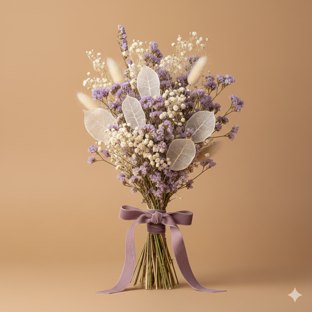 Creado con Limonium (estatice) en tonos lavanda y blanco, gypsophila (paniculata) seca, lunaria blanqueada por su ligereza etérea, y pequeñas plumas de pampas mini en color crema.