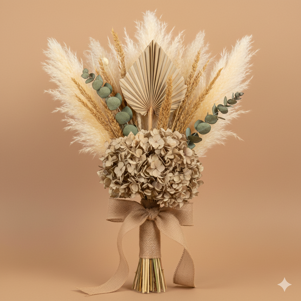 Un ramo creado  con pampas grass natural y tostado, eucalipto populus seco, hortensias en tonos neutros (beige/grisáceo), toques de phalaris y una rama de palm spear seca para emular la famosa «Peineta» de Mónsul.